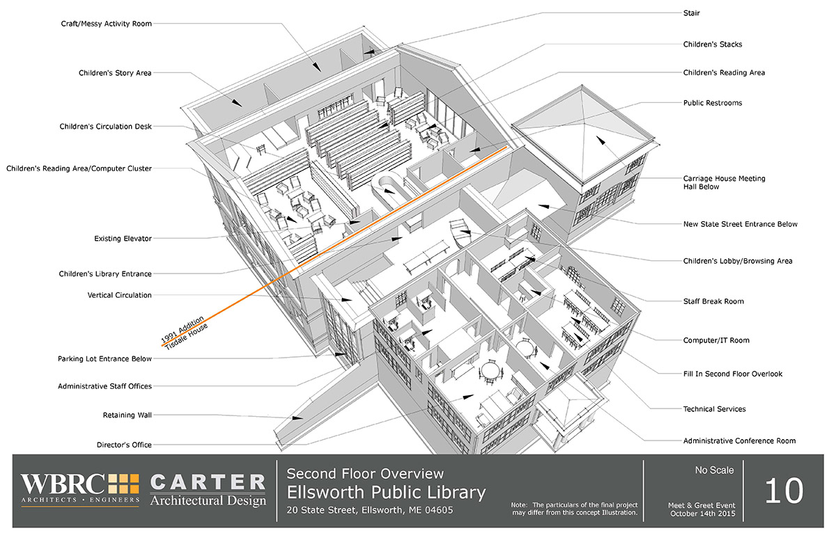 Library Masterplan: This project provided concept level fundraising documentation for the Ellsworth Public Library. The project contemplated tripling the size of the library on a small site. It involved the preservation of the existing historic library building as well as the construction of a large addition.